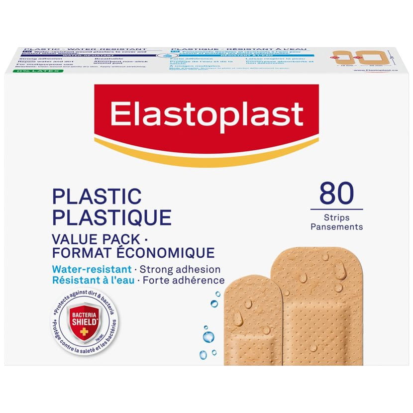 The Elastoplast Plastic bandages are available as strips in convenient different sizes and shapes, which seal all around the wound.